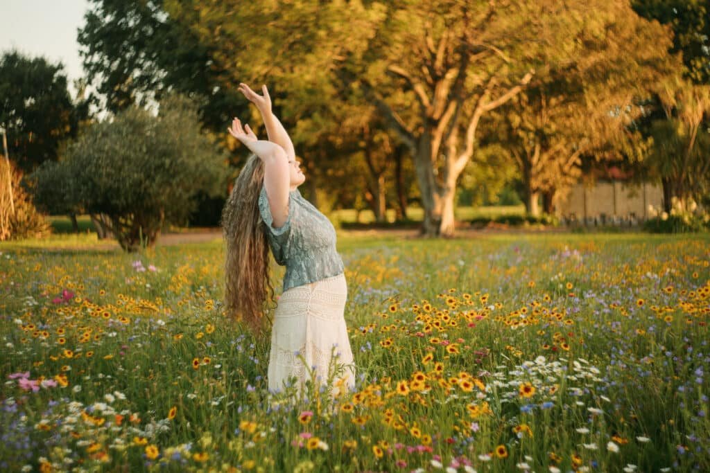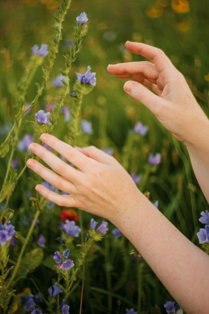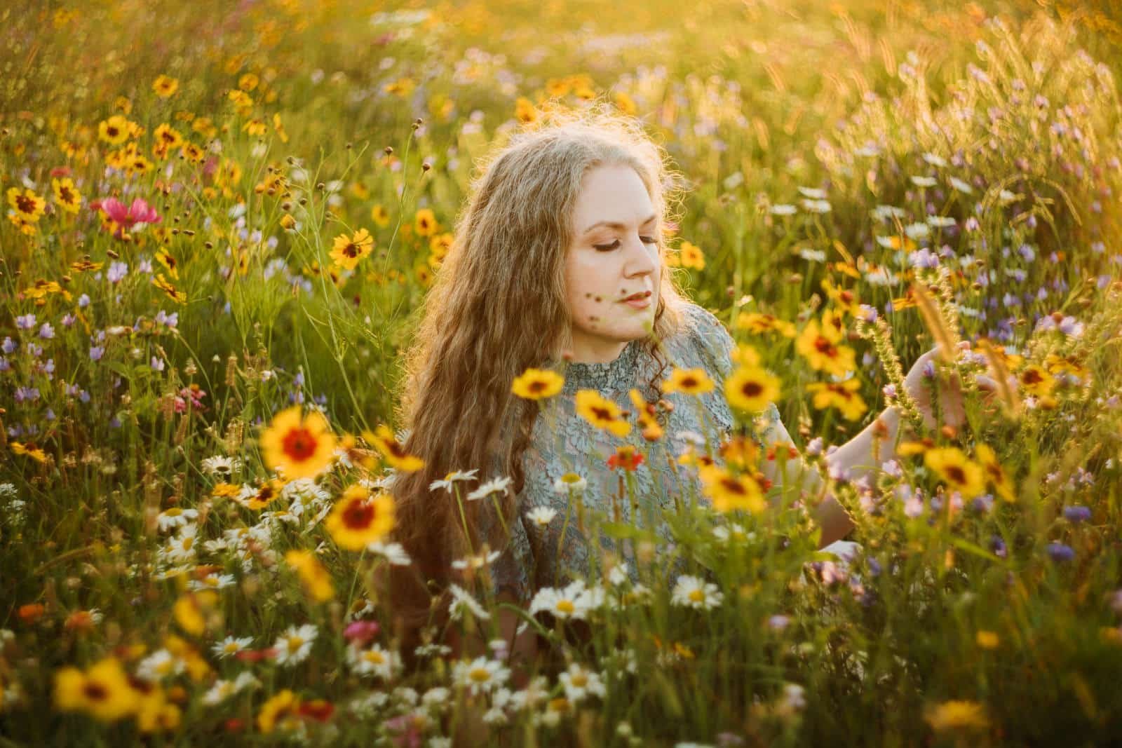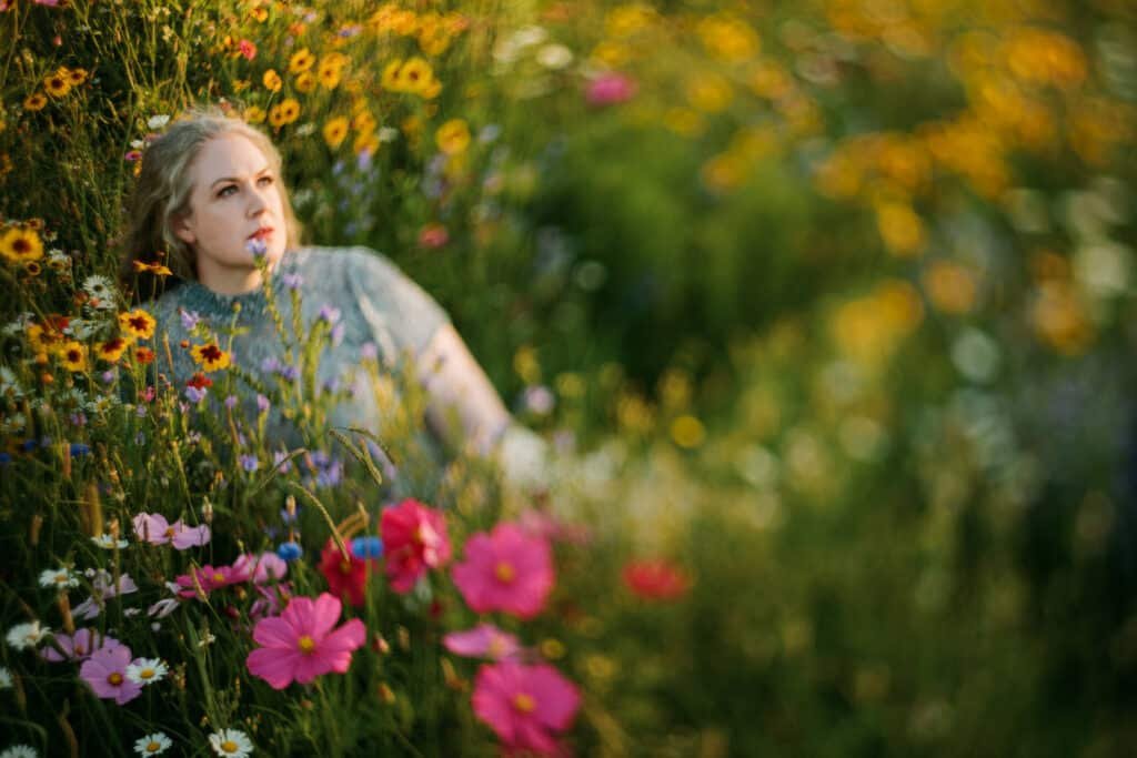 - sitting and leaning into the flowers to soften the body and face
