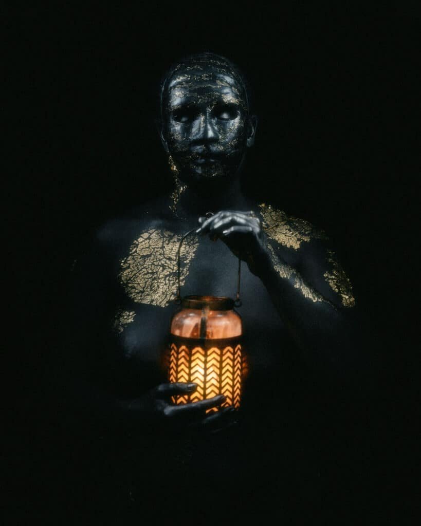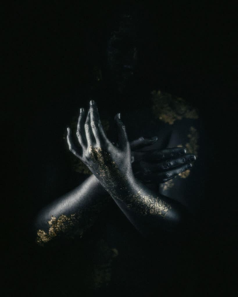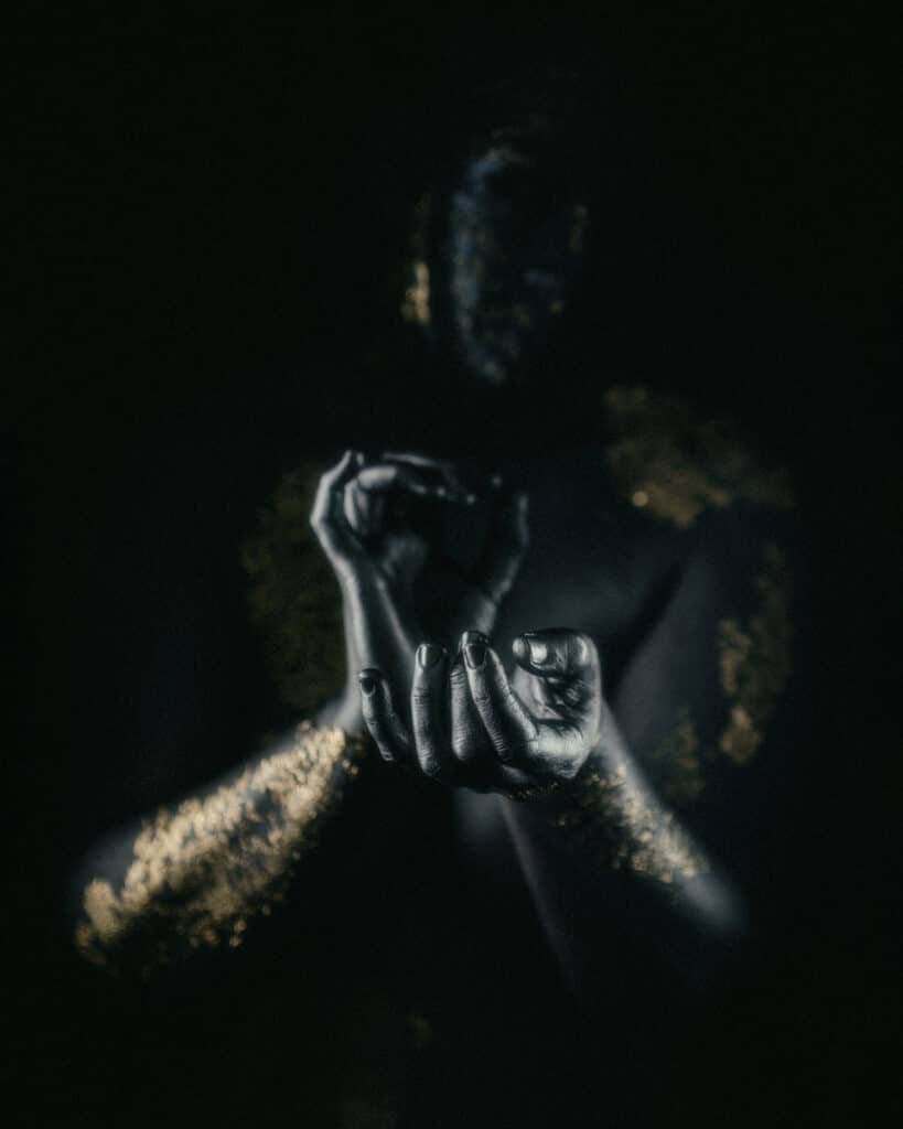 - Symbolism – Gold against black/metalic skin hits a cinematic nerve. Statuesque, you recognise you are looking at a person, but abstract.