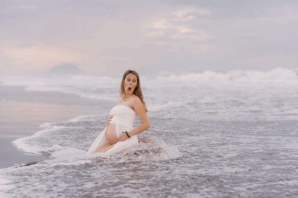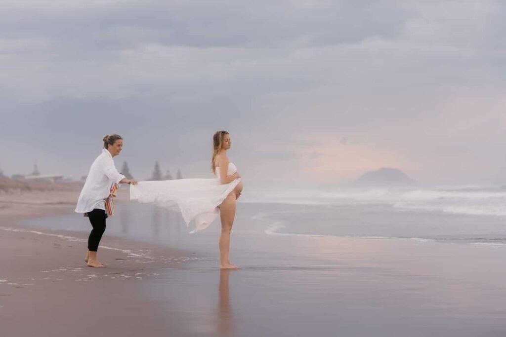 Beautiful, relaxed Papamoa maternity shoot with Rhiannon and her mum Rachel. It was raining, and it looked like we might have to postpone things at the start. But they stuck it out, and things cleared, leaving an empty beach for us to play on. And you know me… gotta end up in the water!